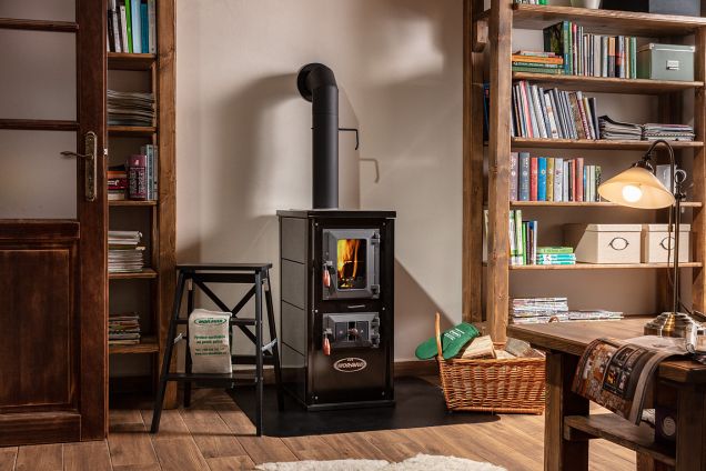 Można w nim spalać zarówno węgiel kamienny, jak i drewno kawałkowe.