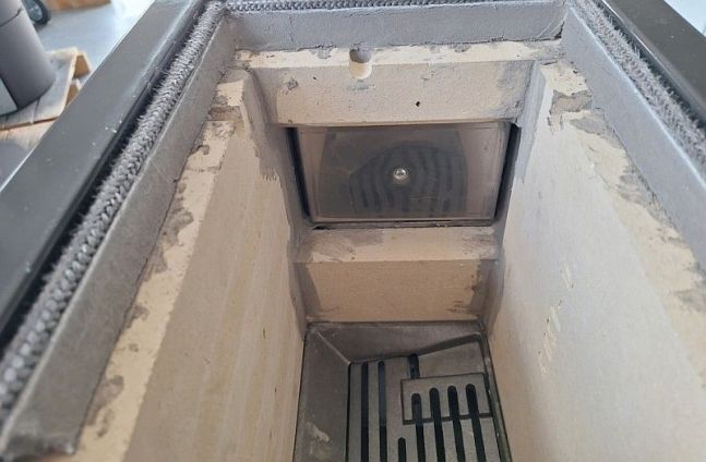 Poniższe zdjęcie przedstawia, pokazaną z góry, po wyjęciu wierzchniej płyty grzewczej, powiększoną komorę spalania (w trybie zimowym), z dolnym wstrząsanym i obrotowym rusztem, po wyjęciu górnego rusztu. Widoczne jest podwójne palenisko na całej swej wysokości, wyłożone grubymi płytami szamotowymi, chroniącymi ścianki paleniska przed wytworzeniem miejscowej wysokiej temperatury, podczas spalania węgla kamiennego.